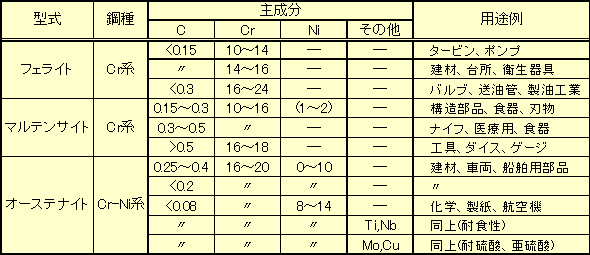 1912年左右,它首先以鐵和鉻的合金形式出現,成為一種防銹鋼。大約在同一時間,還出現了添加了鎳的不銹鋼。現在對表1中所示的典型不銹鋼類型進行了改進。不銹鋼是通過添加約13%或更多的鉻制成的,并且有很多類型。根據各種合金元素的數量,可以創建諸如防銹性,強度,易焊接性和耐磨性的特征。